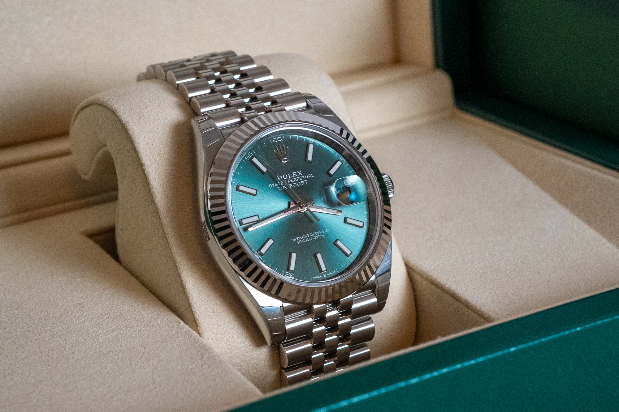 The 41mm Datejust is Rolex’s go-to all-rounder for any occasion. The white gold fluted bezel catches the light without shouting, while the mint green dial adds a modern lift in colour. It’s a piece you’ll keep reaching for. Easy to wear, instantly recognisable, and quietly impressive every time it’s worn.