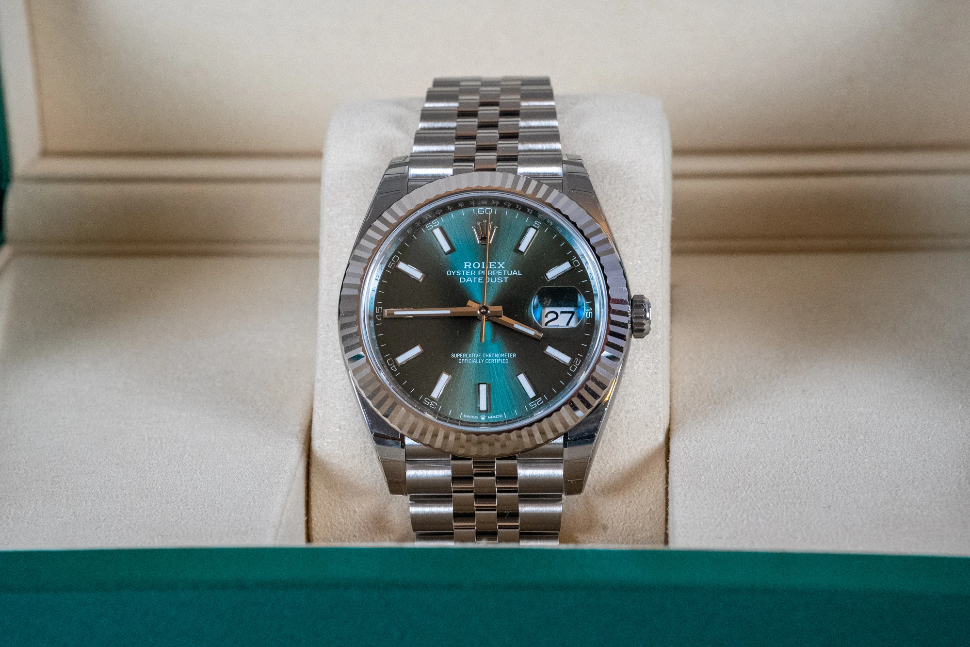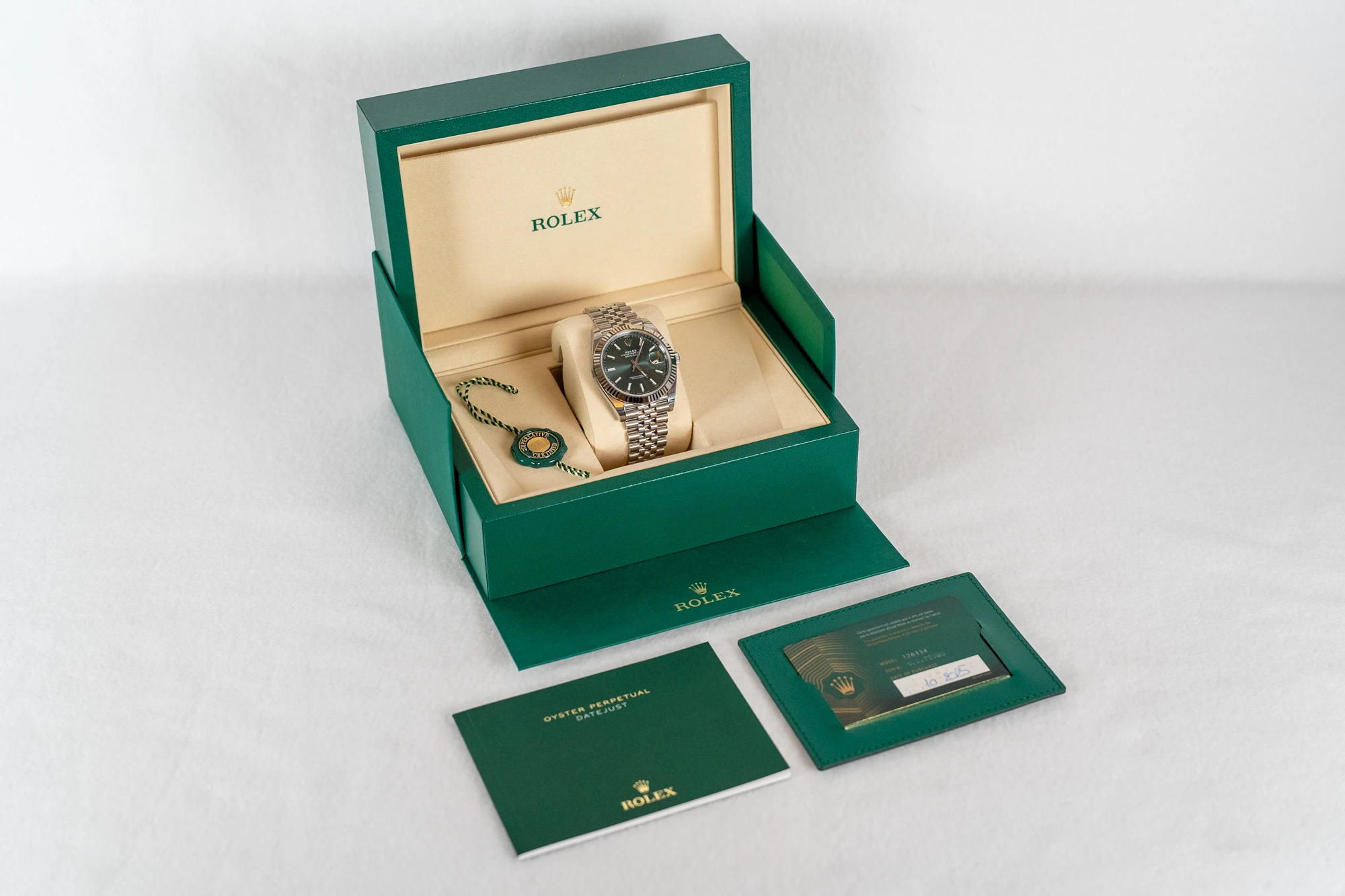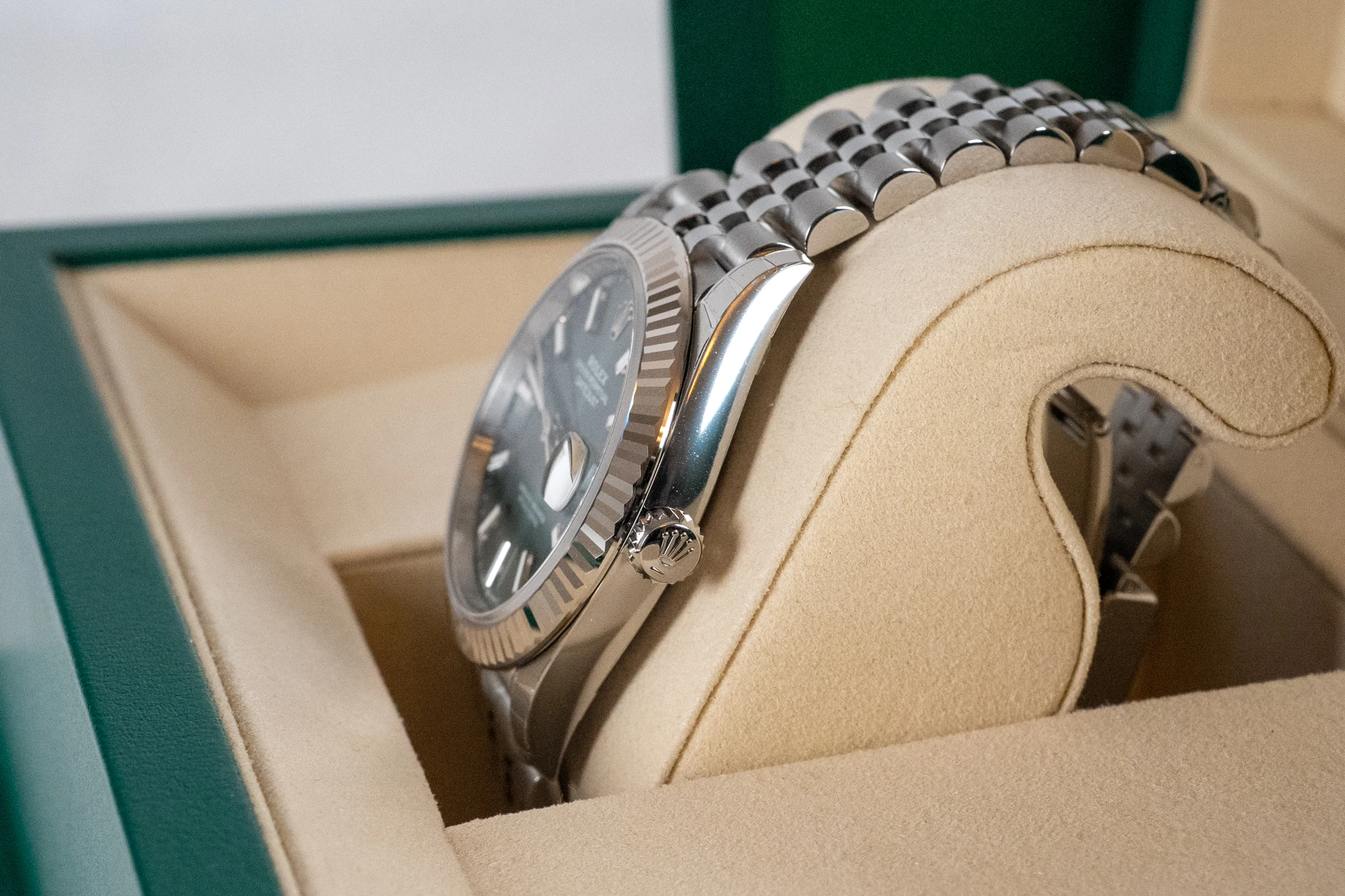The 2025 Rolex Datejust 41, reference 126334, pairs Oystersteel with an 18ct white gold fluted bezel and the highly sought-after mint green dial. Brand new and unworn, it’s presented as a complete full set with box, booklets , green swing tag, warranty card and still retains some of the factory stickers.
