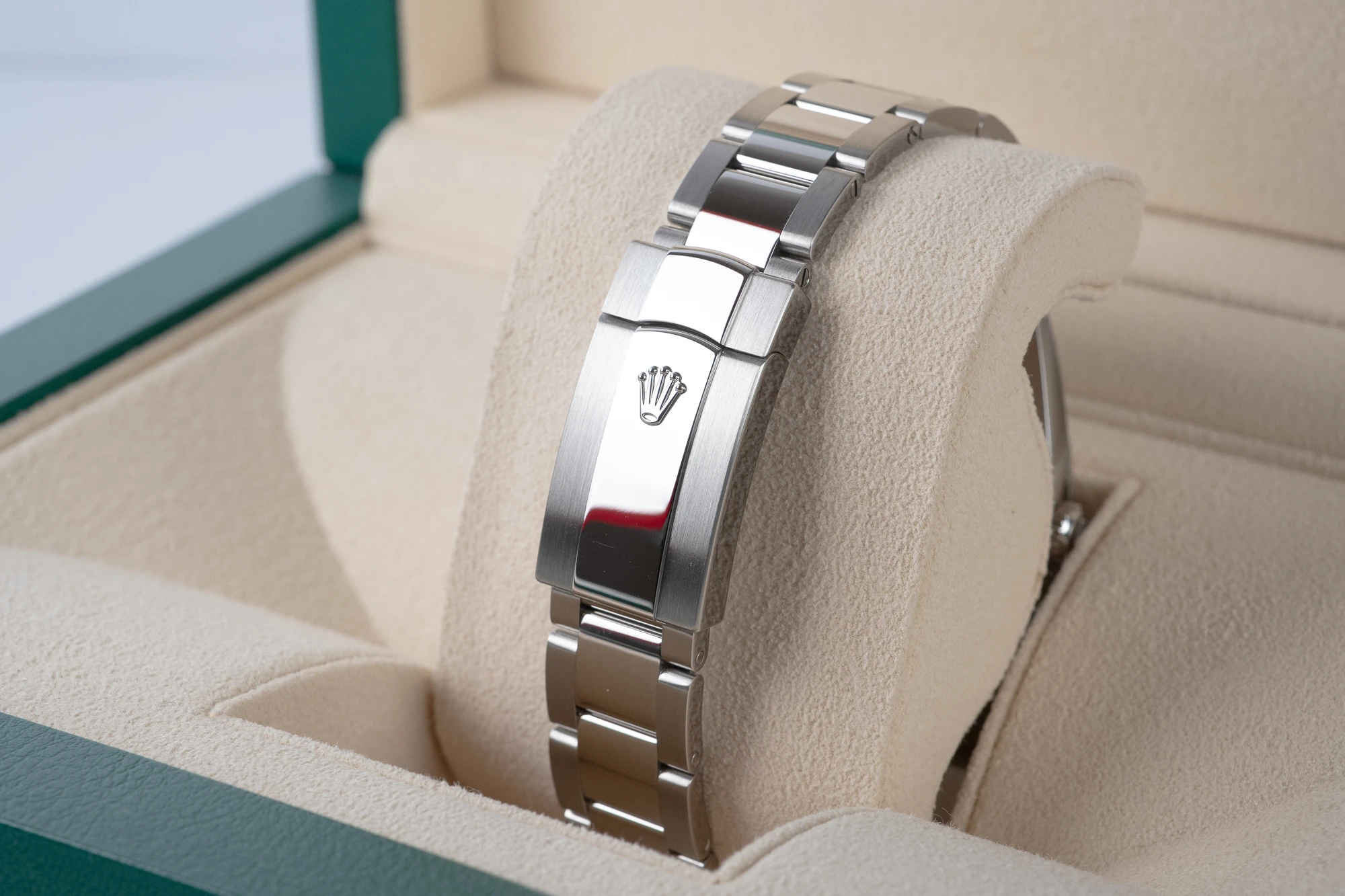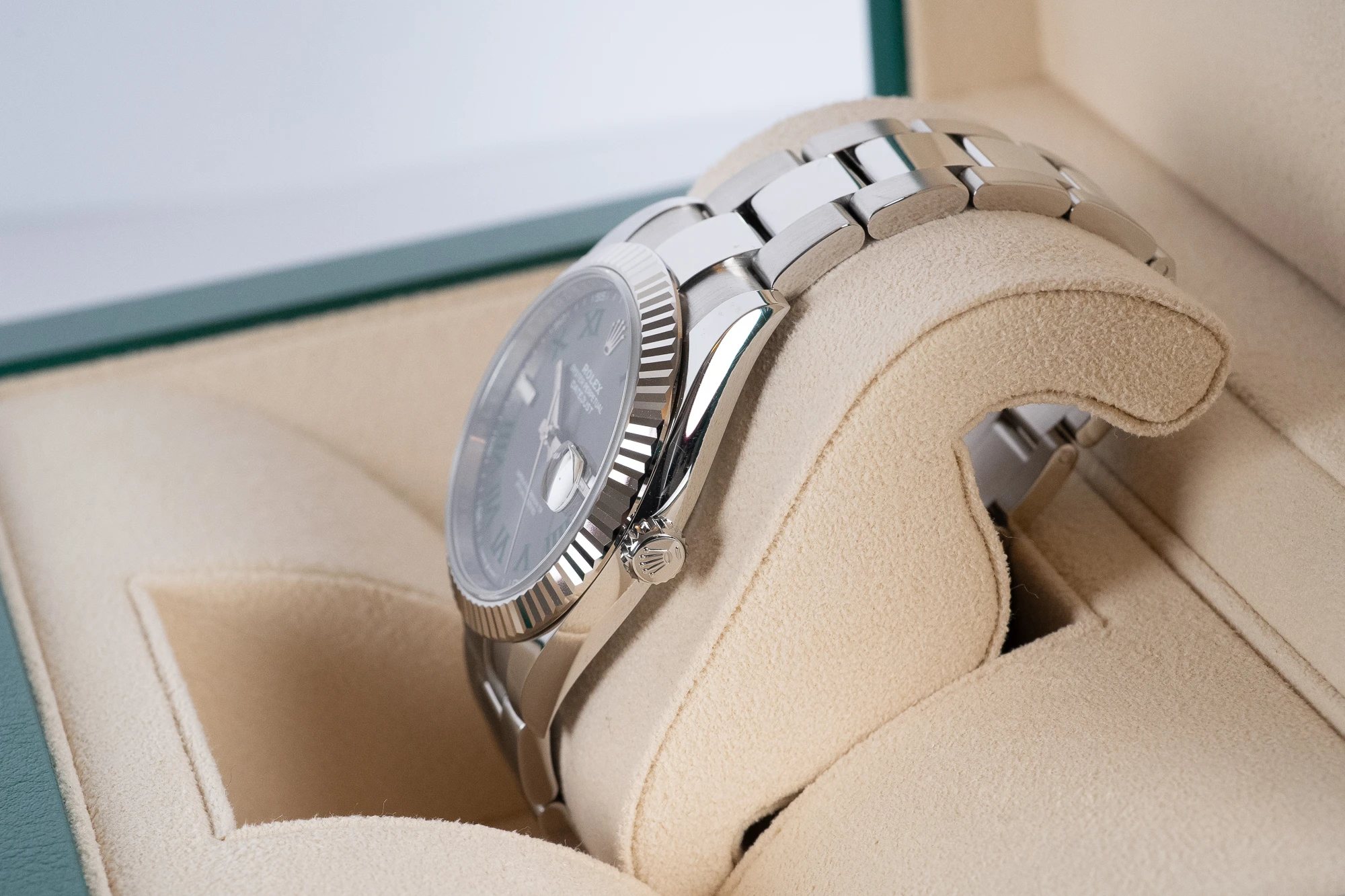 The 41mm Datejust is Rolex’s go-to all-rounder for any occasion, and the Wimbledon dial adds a subtle hit of colour and character that collectors now look for by name. Paired with the fluted bezel and Oyster bracelet, it strikes a neat balance between everyday wearability and that unmistakable modern Rolex aesthetic.