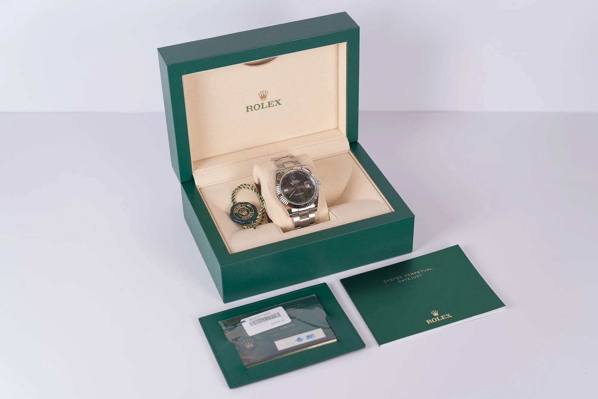 This 2021 example is in like new condition, with the slate dial and green Roman numerals giving it that distinctive and very popular “Wimbledon” look. Rolex international warranty through to May 2026.