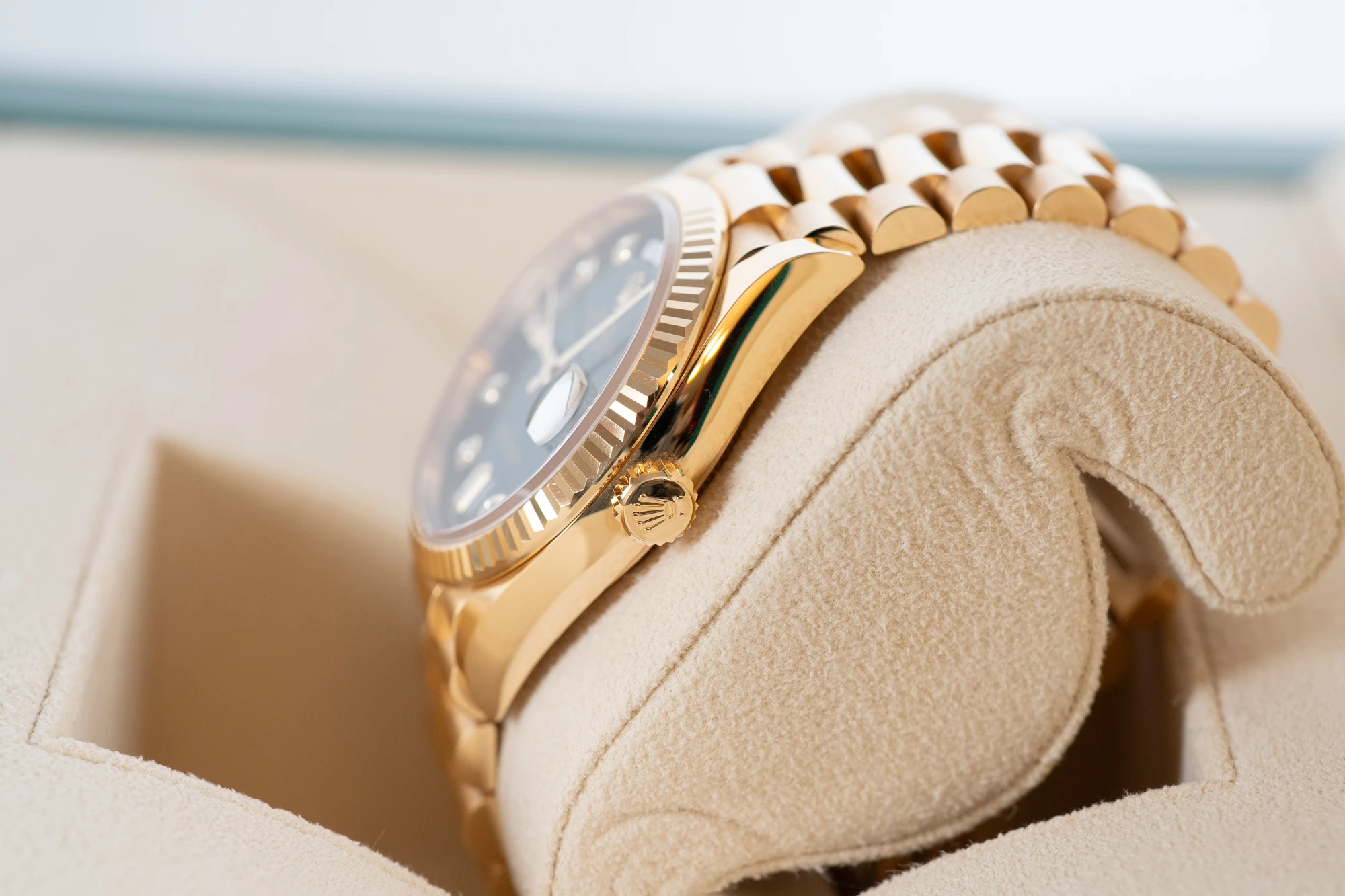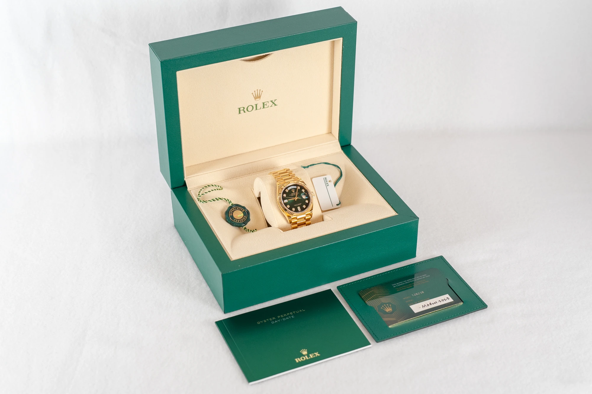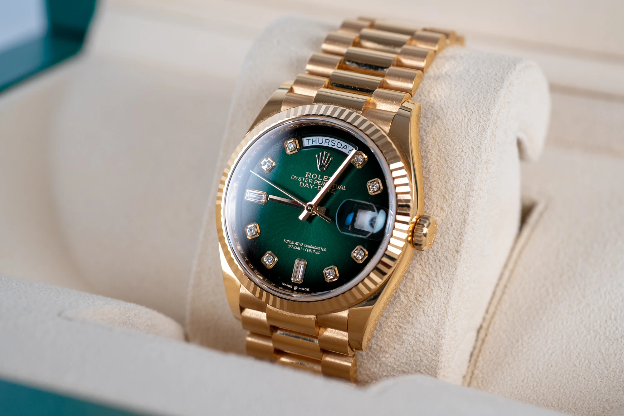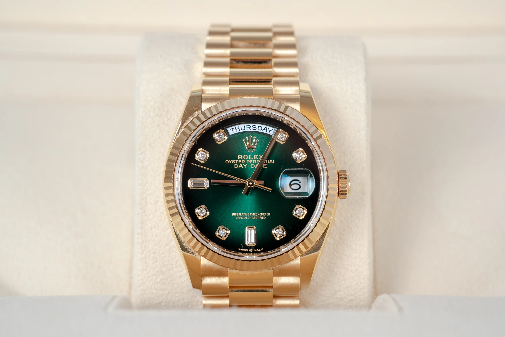The Day-Date 36 is the original “President” the watch Rolex themselves describe as the ultimate watch of prestige. The combination of solid yellow gold, the three-link President bracelet and the day and date complication has made it a long-time favourite of leaders, musicians and literal Presidents. In green ombré with diamond markers, this reference is a highly desired classic and is truely something special.
