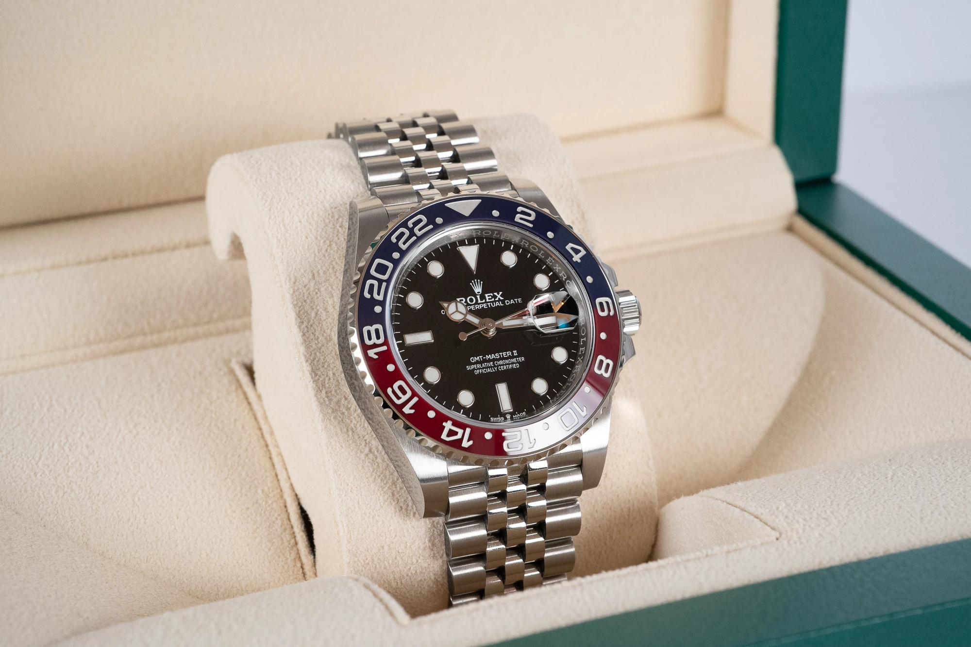 Rolex GMT-Master II “Pepsi” 126710BLRO on Jubilee pairs the iconic red and blue Cerachrom bezel with the five-link bracelet most collectors associate with the classic GMT look.
