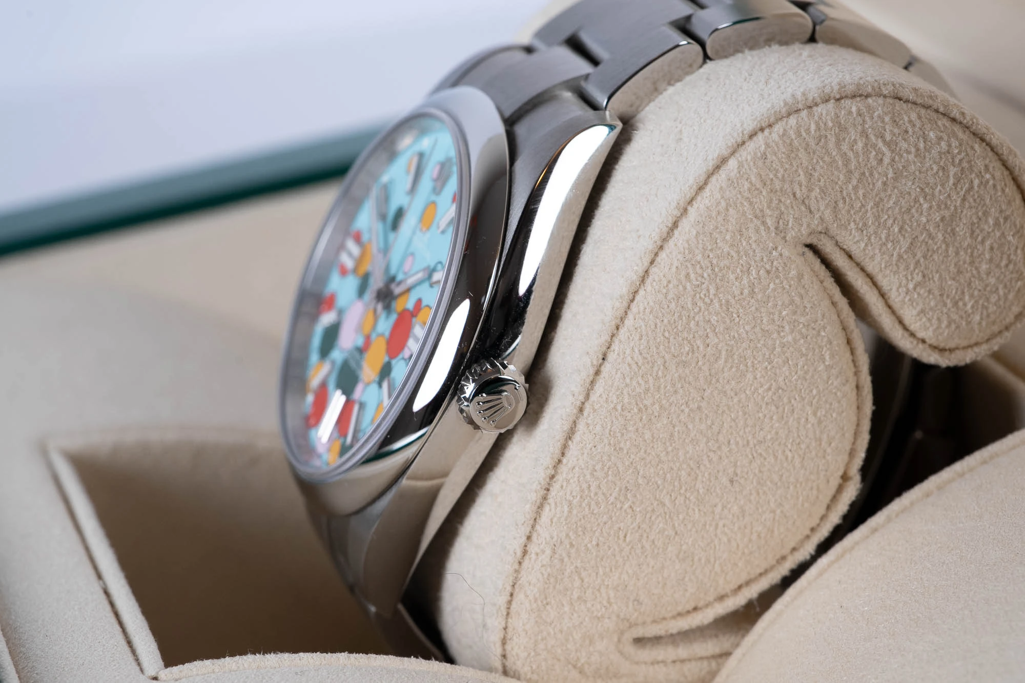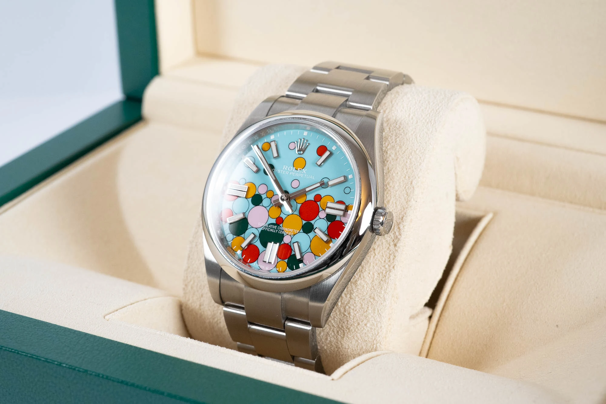 Produced from 2023 and discontinued in April 2025, the Celebration Dial had a short run, which is a big part of why collectors treat it differently from a standard Oyster Perpetual. It is rare, playful and unusually bold for Rolex, making it a strong piece for collectors or for someone who simply wants something genuinely special.