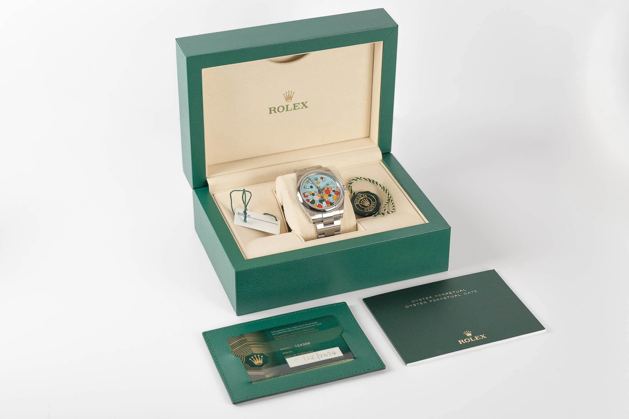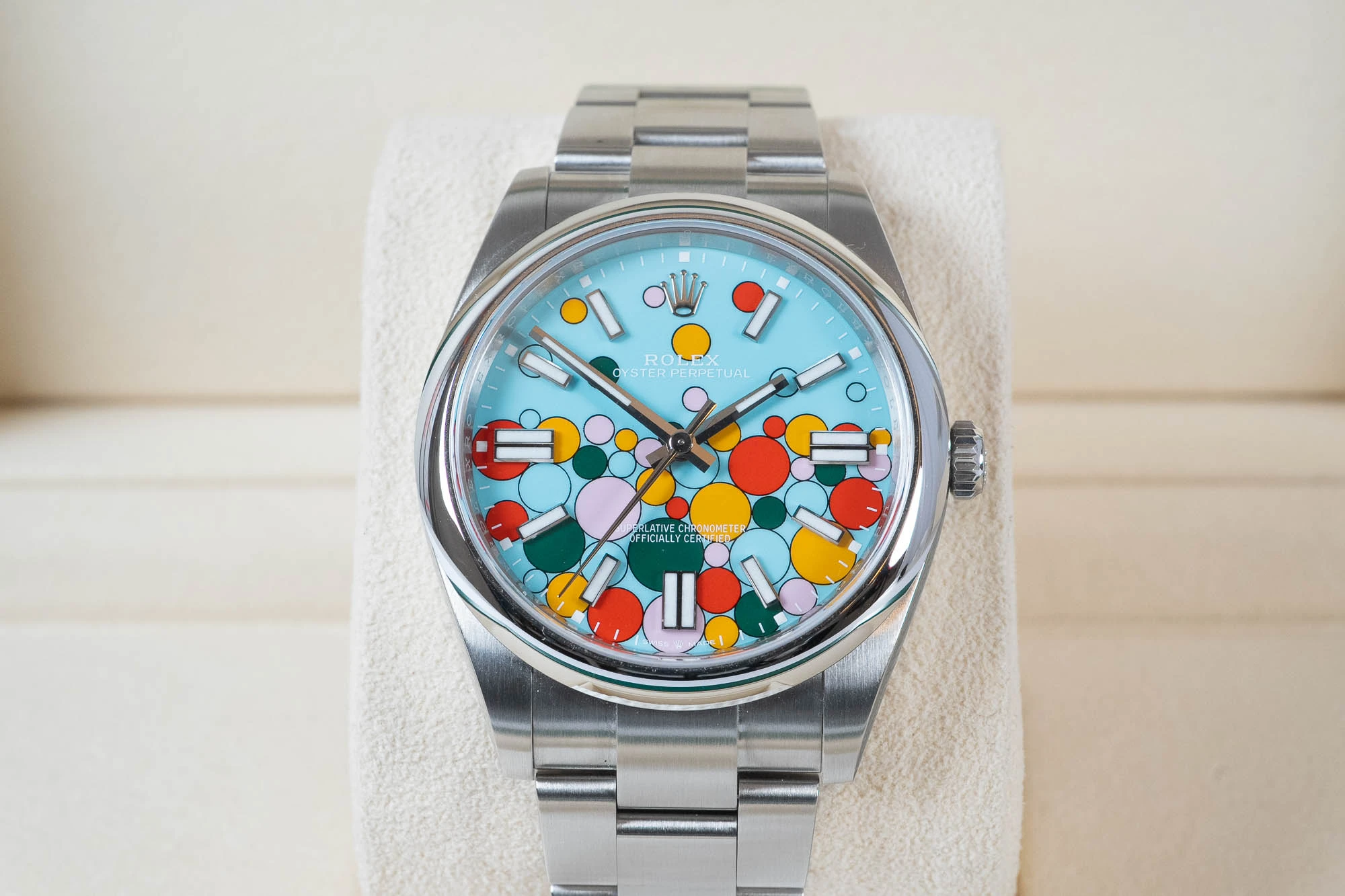 The discontinued Rolex Oyster Perpetual 41 “Celebration” Dial, reference 124300, pairs the colourful lacquered bubble motif with the clean 41mm Oystersteel case and Oyster bracelet, creating one of the most distinctive modern Rolex dials of the last few years.