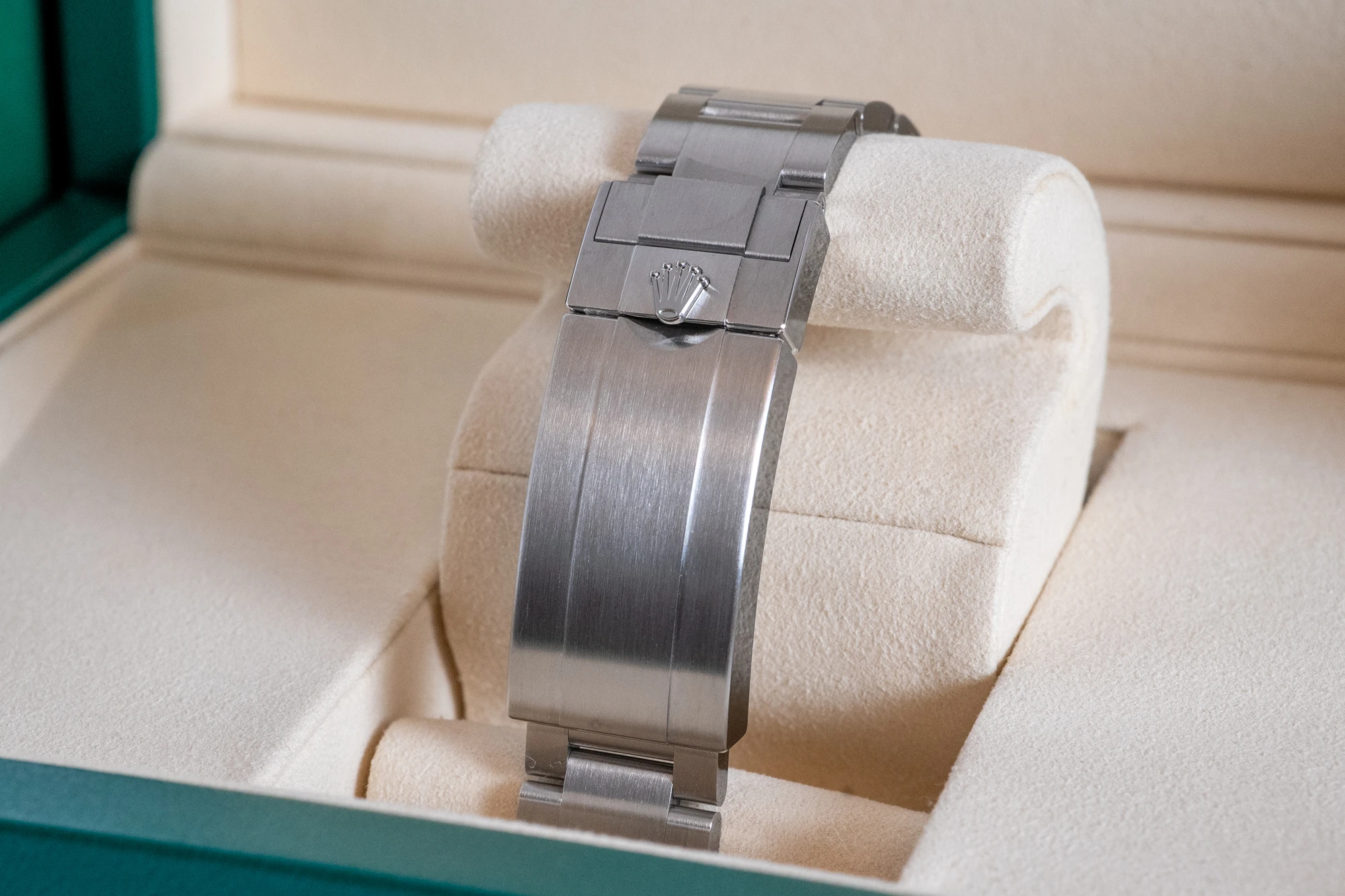 Brand new and unworn, it’s offered as a complete full set with box, booklets, Rolex warranty card, green and white swing tags for 2025. Rolex international warranty valid through to 2030.