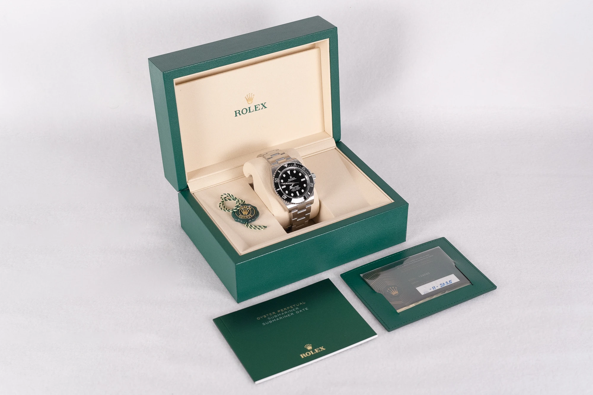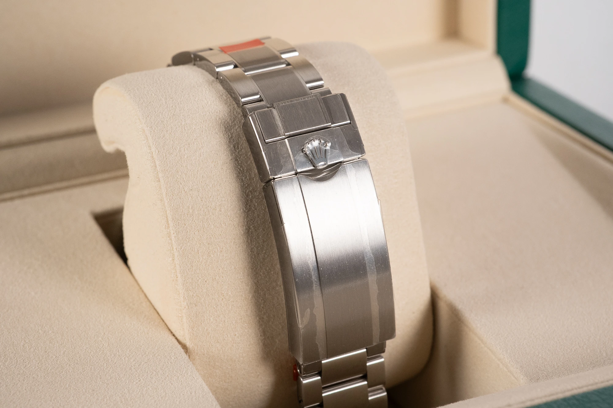 This example is brand new, fully stickered and unworn, sold as a complete full set with box, booklets and Rolex warranty card dated Nov 2025, with Rolex international warranty through to 2030