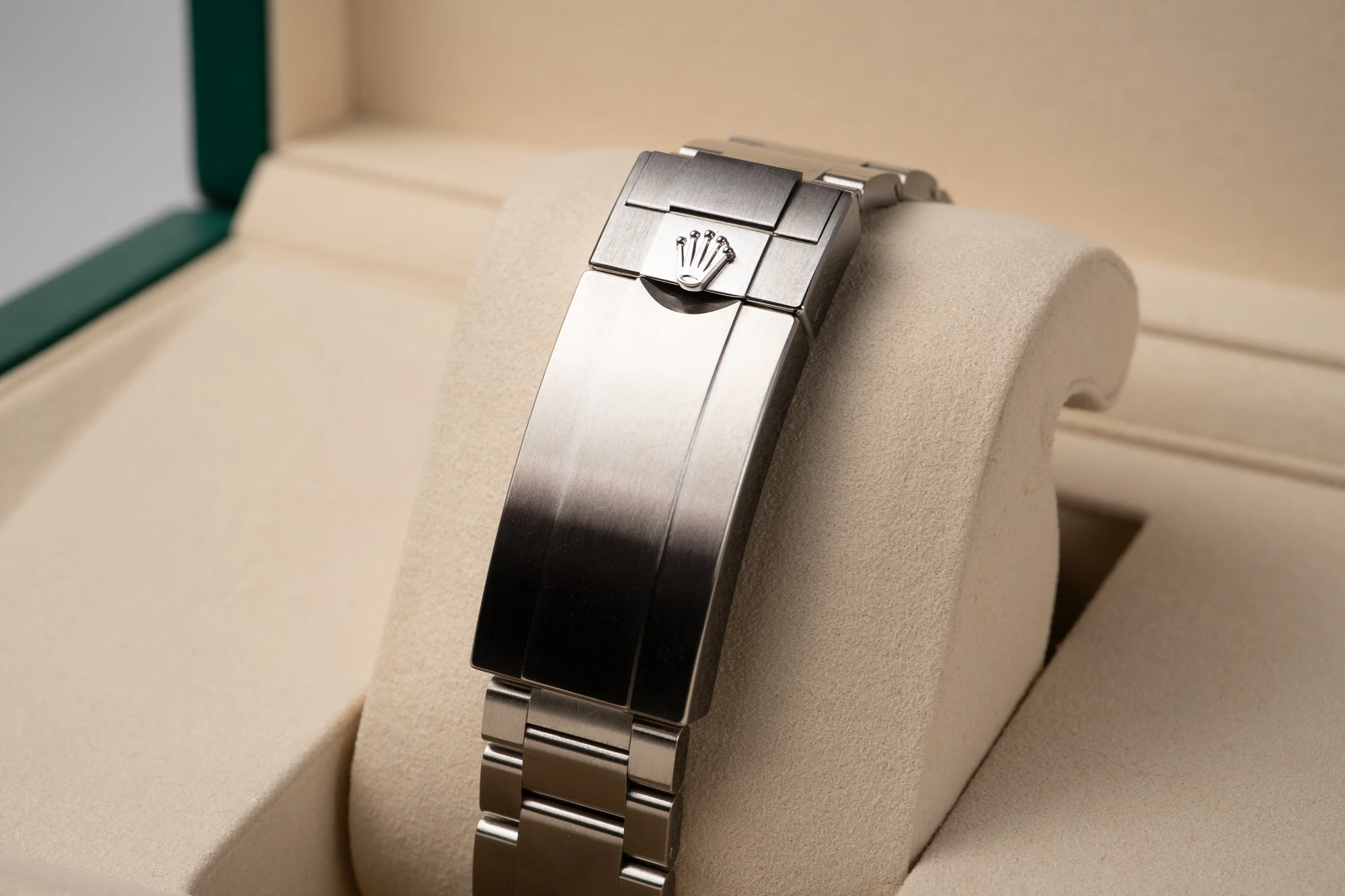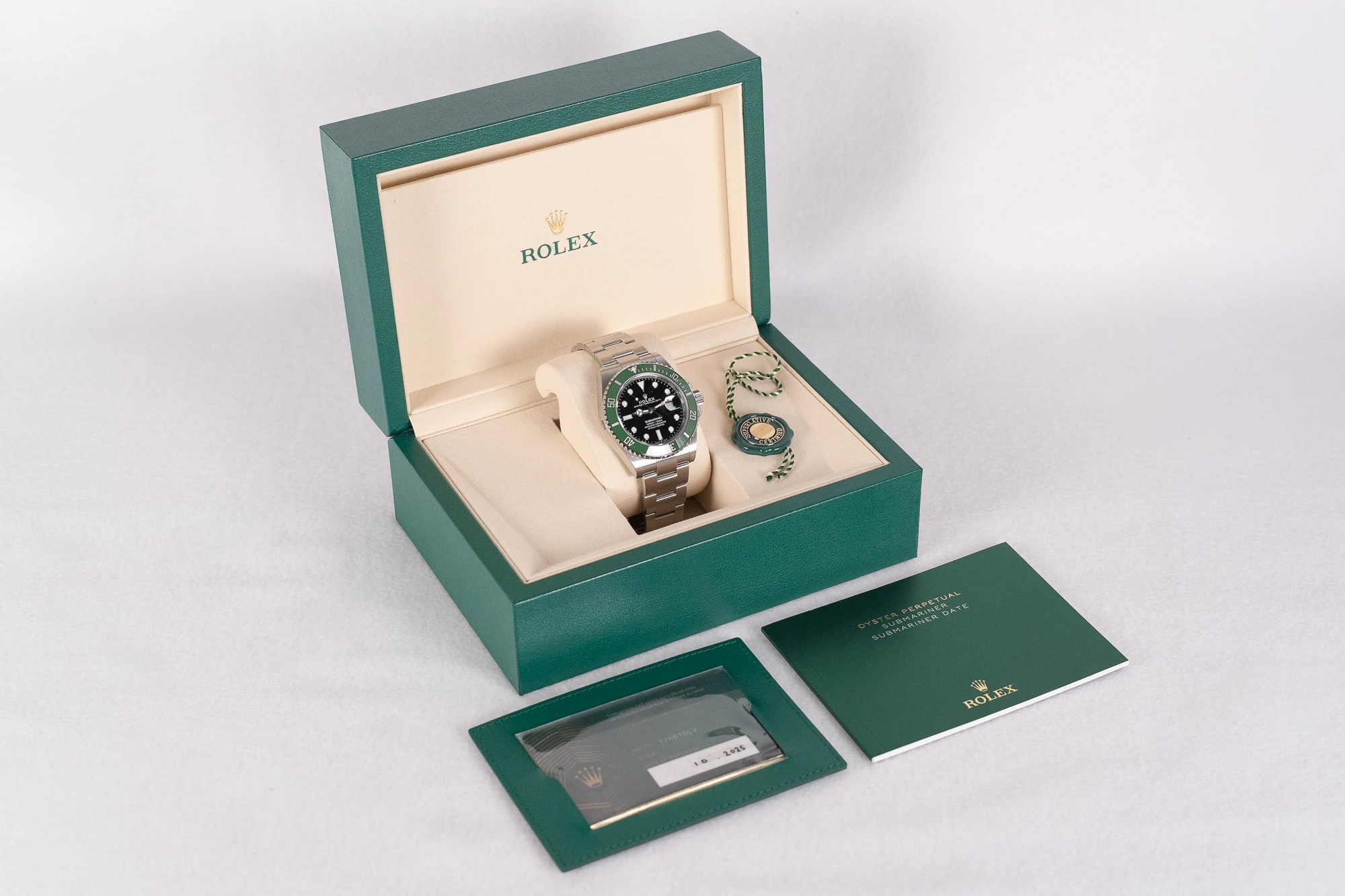 This example is brand new and unworn, sold as a complete full set with box, booklets and Rolex warranty card dated 10/2025, with Rolex international warranty running until 2030.